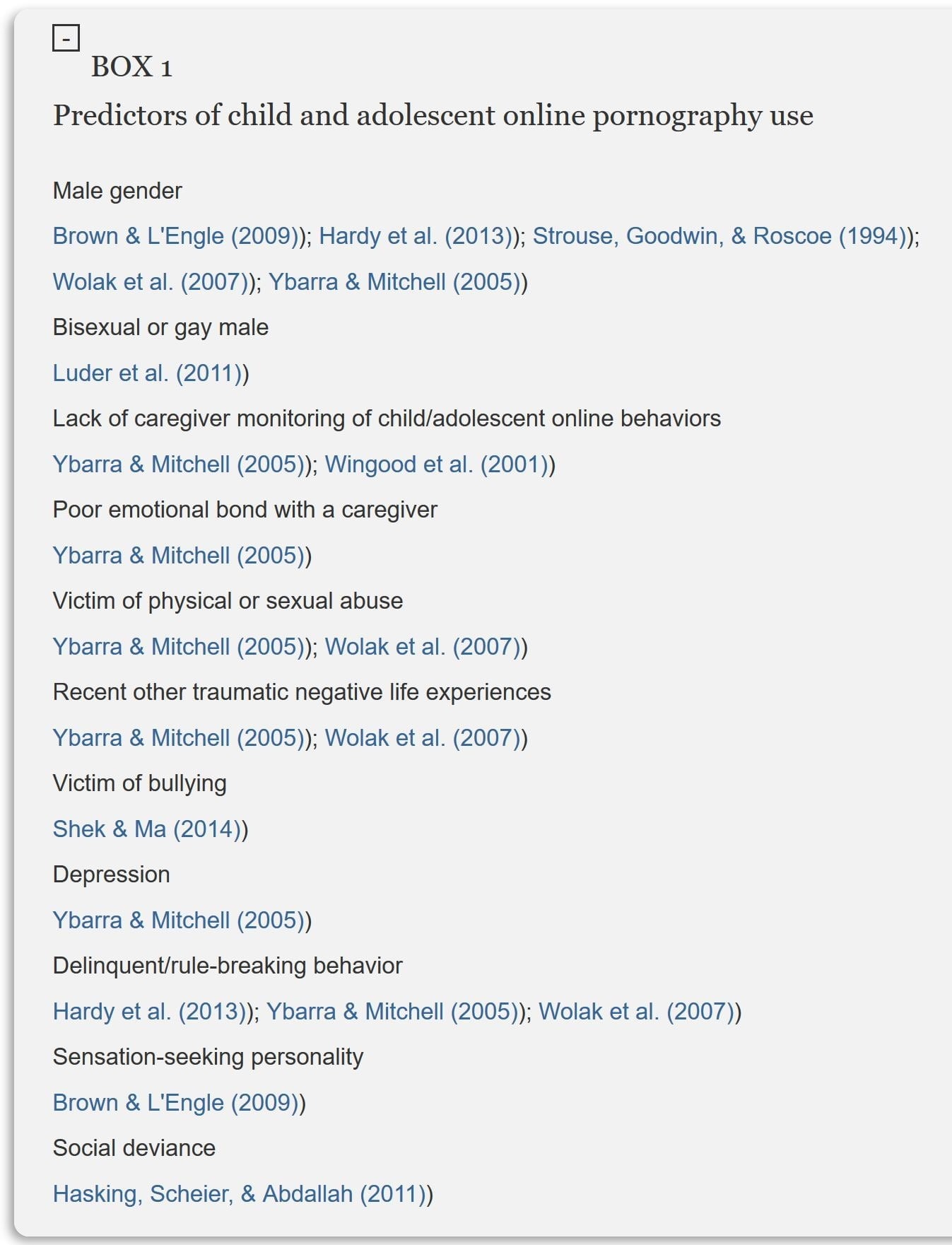 Certain factors are important predictors of child and adolescent pornography use (Box 1). Demographic factors associated with increased pornography exposure include male gender and lower socioeconomic status (Hardy et al., 2013). Bisexual or gay adolescent males tend to use Internet pornography more often than straight males (Luder et al., 2011). Family factors can also increase risk for pornography exposure. Living in a single-parent home, lower level of caregiver surveillance, and weak emotional bonds with caregivers can lead to increased pornography exposure (Ybarra & Mitchell, 2005).
