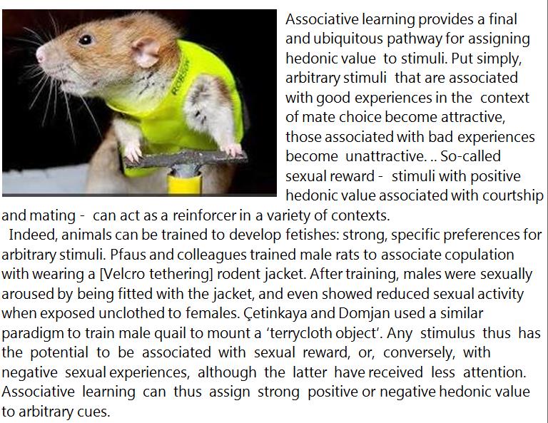 A Concordia University team led by James Pfaus and Gonzalo Quintana Zunino has previously shown that that male rats can be conditioned to prefer ejaculating around females who bear a particular odor (almond, if you’re wondering). These males were rewarded during their post-ejaculatory state. The team also found that virgin male rats wearing a special rodent-tethering jacket during their first sexual experience lose sexual arousal and motivation if the jacket was removed before another act of copulation.