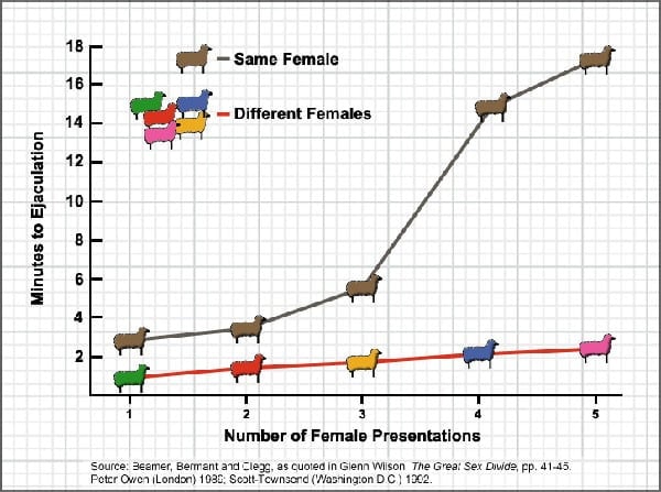 Consider this graph. The fifth time a ram copulates with the same female, it takes him 17 minutes to get off. But if he keeps switching to novel females…he can do his duty in less than two minutes, five times in a row.