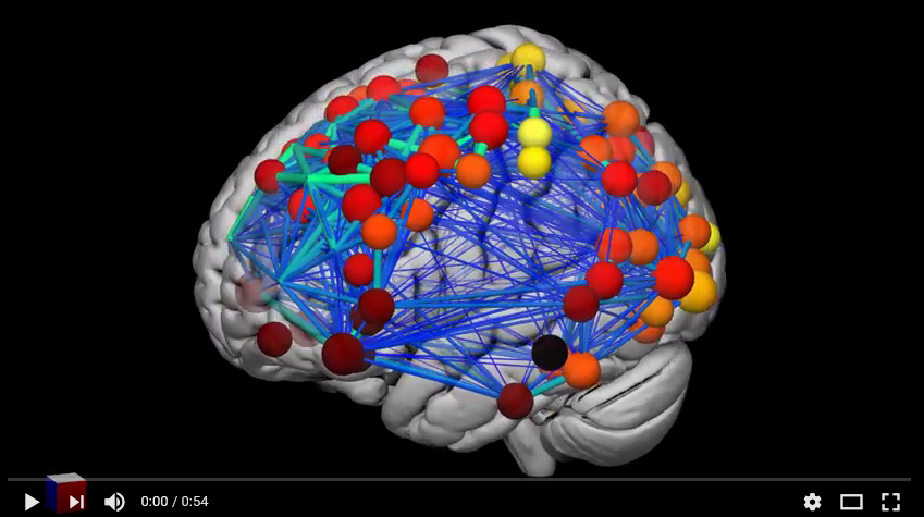 Nodes of the adolescent brain’s structural network coloured by how much they change between 14 and 24 years of age. The size of the nodes represent how well connected they are and halfway through the movie the smallest nodes are removed and only the hubs remain. The edges that are added in are the strongest connections between these hub regions and represent the brain’s rich club. Credit: Kirstie Whitaker